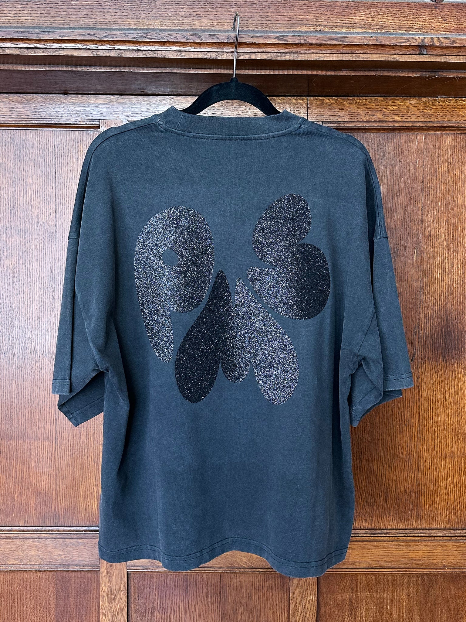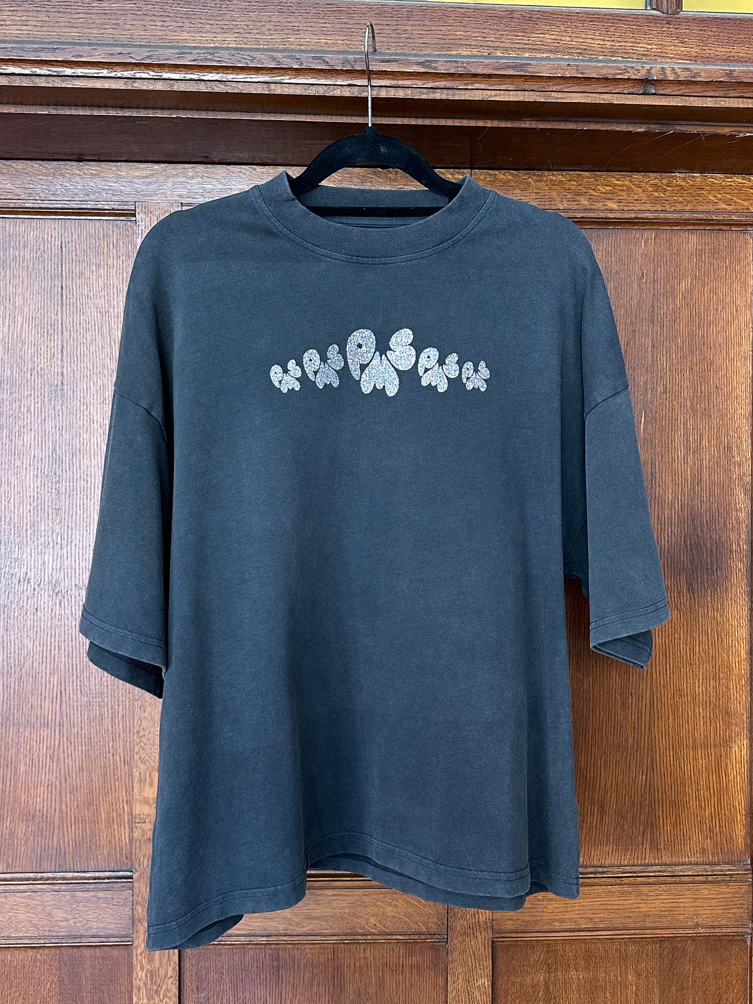 PINK very sparkly small design on front, and large PMS Logo on back on BLOCK GREY heavy organic cotton fair trade t-shirt in a oversized boxy fit.